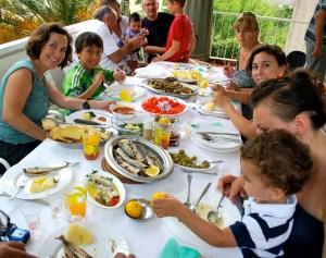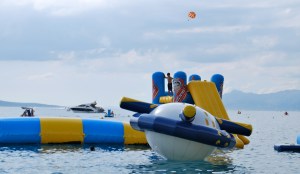 We started off the day eating in the hotel breakfast area, and playing with Daniel. After the scrumptious breakfast, we all (10 of us including kids) went back to our rooms and got ready for a quick swim in the Adriatic Sea. Only Keegan, Zlatko, and I went swimming, it was really fun once you got used to the cool temperature. The first day it took me forever to get in but by the time we left I would just jump right in. Sadly, while we were in the water Keegan and I saw a dead bird’s whole body faced down floating! Very sad/creepy. After showering we got dressed and took the acoommm (a car or van in Daniel’s 2 year old language-he’s very cute) to visit one of Gorinka’s friend’s old house in the city of Makarska. It was close to the top of a mountain and when you looked up into the mountains you saw the really fluffy airy clouds resting there. This was a very old house that the man and his wife (who had been born there) had done a lot of improvements on, he was very proud and the house was very cool with an awesome view of the sea and the mountains. They have tons of olive trees on their property and when they harvest them they take them to an olive oil factory in town and have extra virgin olive oil made. Toni, Mom, and I thought that at any moment the ‘Cullens’ (from the Twilight series) could come flying down running at lightning speed ;). We then took the big van (acoommm) to the beach of Makarska. The beach was so much more crowded than the one in Brela (our beach). The families split up and explored on our own. Our family went and had a quick snack and walked around the city, which is a major tourist site. We then met back up with our friends, who had somehow (beyond me) gotten a spot on the busy beach. Keegan went on this fun plaything shown in the pictures below. You paid a fee and were able to climb and jump on the cool stuff in the water. He jumped on this mat thing, they call it the blob and moved to the end of it and then another boy that he had been talking to (good-looking by the way ;)) jumped on the other end and Keegan went flying!!! He went at LEAST 15-20ft in the air! My stomach went to my throat as I watched him fly through the air. “SH*#*T!!!!!!!!” screamed my very scared mother. People on the beach clapped and cheered. He was up immediately and laughed it off, but then he didn’t eat that much later . . . After that very exciting/scary experience we all headed to the acoommm to put our beach stuff back, we then walked to Gorinka’s friends other house for some dinner. When we arrived we were told that we were going to have a traditional Dalmation prepared dinner. So we had appetizers, fish soup, fish (the main dish) they brought out two huge trays of fish — sardines and some other fish they had made, various side dishes and then dessert. It was a very tasty meal! Our host was a very kind older man and his wife. The wife made the food and the man made the ladies jewelry as a gift to take with us. They were necklaces and bracelets made of shells. After a great evening we said our goodbyes, and headed to the acoommm. When we got back my family stayed in and watched some TV (English with Croatian subtitles) and then very quickly went ‘nitey nite after a long great day.