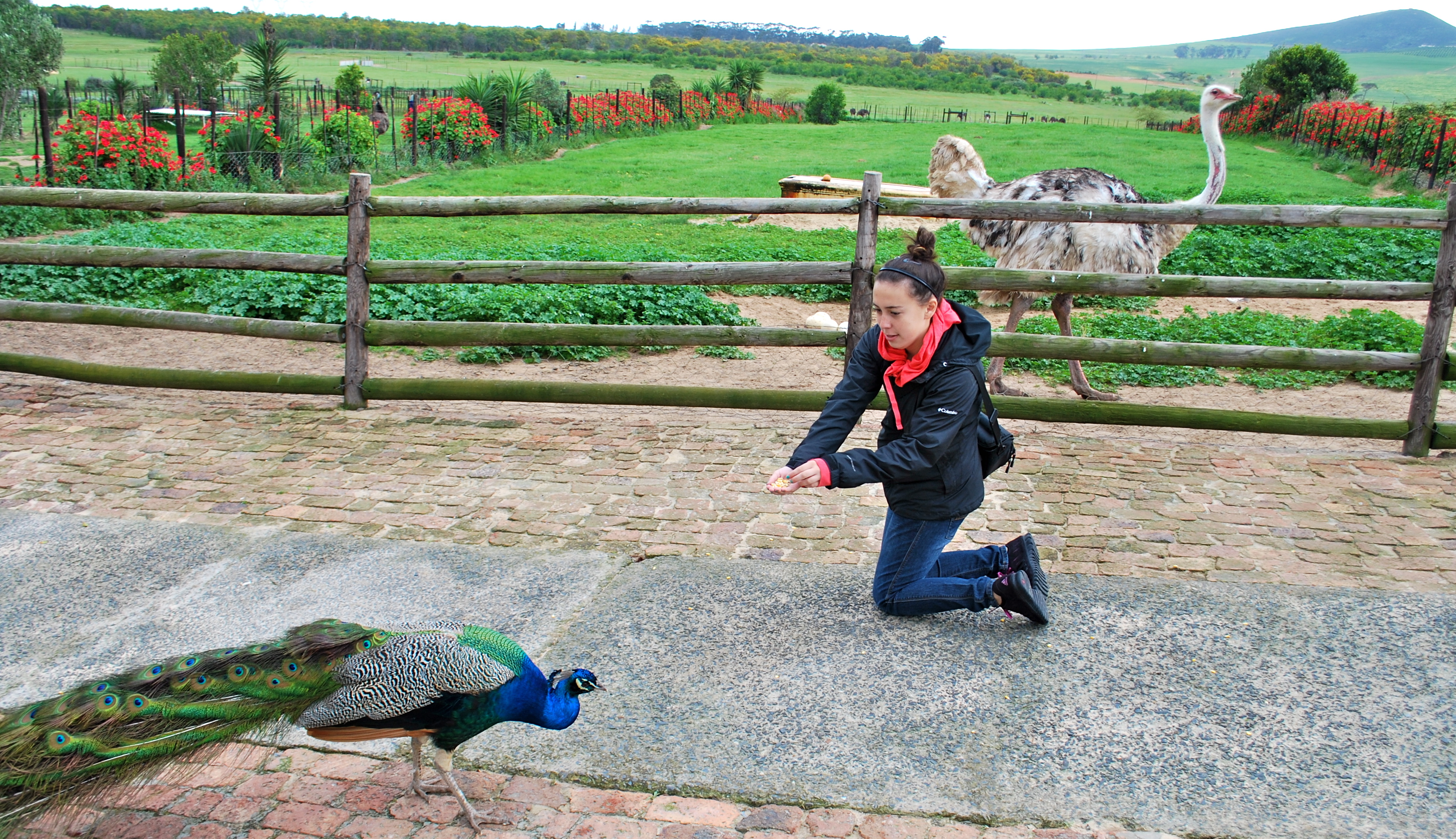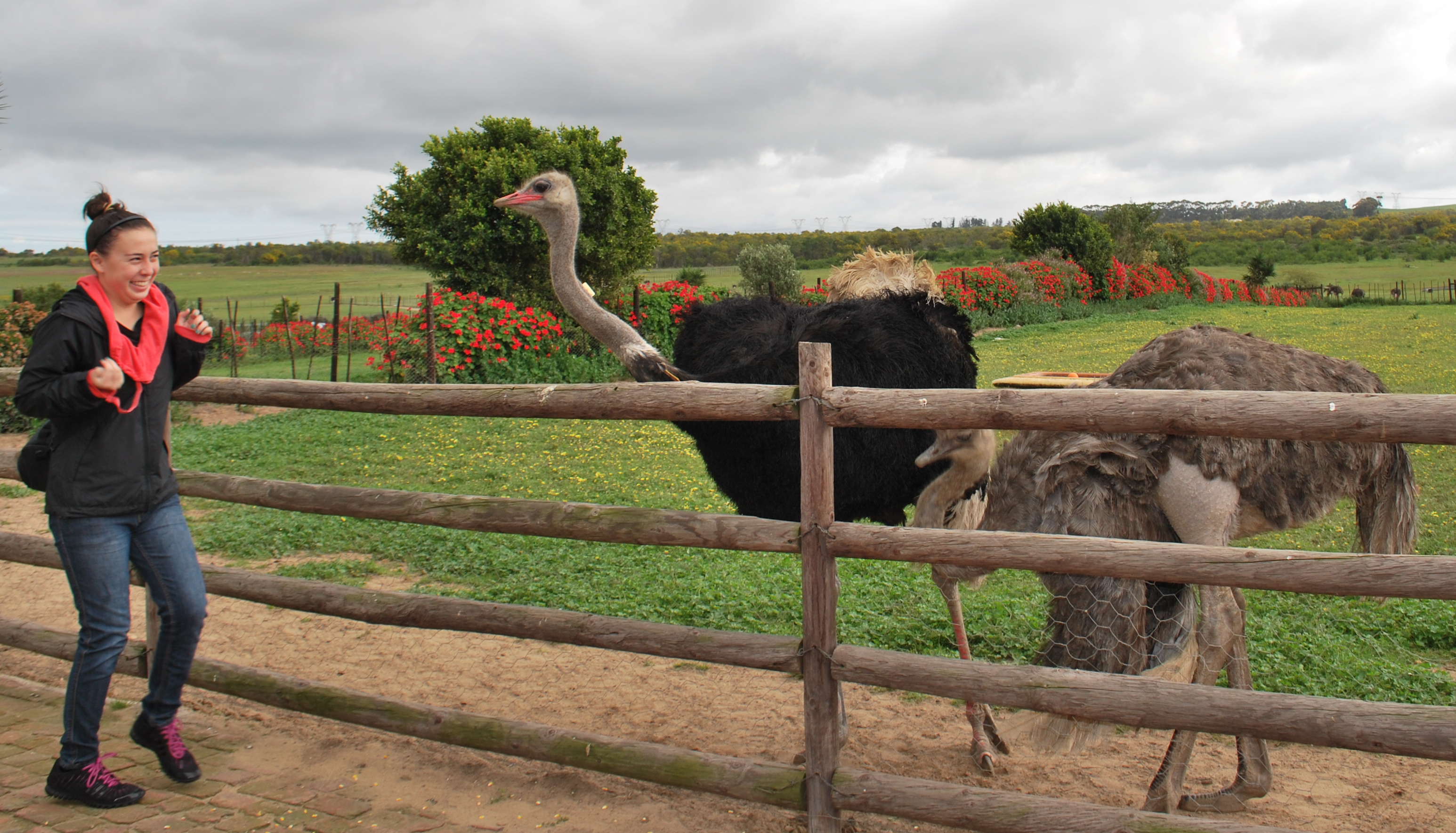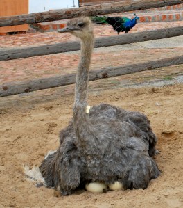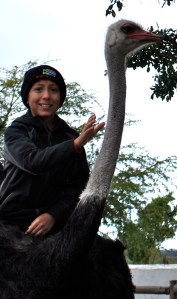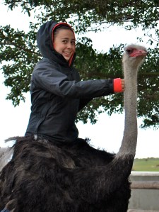 We visited the West Coast Ostrich Ranch this week and it was such a warm, comforting experience. It is only about a 20-minute drive from Cape Town so a great distance for a day trip. The Ranch is on a rolling piece of green, lush land and you can see Table Mountain in the distance. Everywhere in Cape Town is prettier than then next. The man that gave us the tour, Omar, knew everything there is to know about Ostriches. He took his time showing us around and we felt the pride he had in his workplace. It’s nice to meet people who really love what they do and are eager to share their knowledge with you. We had a tour of the museum, learned about the ostrich skeleton, their vision, speed and the history of the ostrich in this area. The ostrich has no teeth and swallows everything whole (they say to keep your cell phones and small cameras in your pocket because they can swallow them). They then eat stones to help digest what they have swallowed. At one point ostriches were poached because in their belly they would find different gems – diamonds, emeralds, etc., these beautiful gems were then sold for a lot of money. Africa is known for it’s rich minerals and once the locals figured out that the ostriches were eating them, they became a fast way to find the gems and make some money. Since it is spring here in South Africa the birds are a little aggressive, it’s mating time. What was fascinating was the male Ostrich’s beak and legs turn bright pink to attract the women (if you know what I mean). Our trip was the full experience. We even stood on the eggs – they are so strong and weigh between 3-5 pounds. One egg is equal to the size of 24 chicken eggs, – – maybe use an ostrich egg for your next large brunch, only one egg to crack! We even sat on an Ostrich. Some ranches allow you ride them – this ranch (and I think it’s this part of South Africa) find it inhumane to ride them. It was an exhilarating experience just sitting on them. They cover their head with a fabric bag while you mount them, then they lift the wings so your legs lay between their body and wings – it was a very warm seat on a cool and windy day. Just in July of this year the Guinness Book of World Records announced Ostrich Tom (who lives on this ranch) as the shortest Ostrich in the World. (I know a couple other short Tom’s but they have not made it in the Guinness Book of World Records!) The Ranch has a wonderful gift shop that sells all things ostrich; purses, belts feather dusters and decorated eggs. Our tour ended with lunch where we enjoyed, Ostrich filets, burgers and eggs. Another fact, actually fiction, that made the guide roll his eyes is the story of the ostrich sticking his head in the sand – – – it’s just a story – – – not one bit of truth to that!