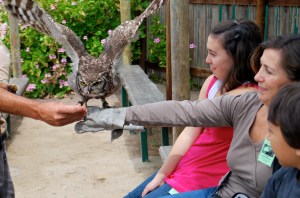 Last week we went to this place called Spier. Originally the plan was to eat BIG for lunch at a really cool restaurant at Spier called Moyo (it’s buffet style) and has an African music show, but . . . we decided it was best if we just went to see the animals rather than pig out. The cool thing about Spier is that it is not only a vineyard, but it has Moyo, another restaurant called Eight, cheetah’s, horseback riding, segway tours, a hotel (we ate in their bar), and it has a bird-of-prey rehabilitation center. Driving up we immediately saw the cheetah’s, they were big and beautiful let me tell you, they are something else 🙂 . We had wanted to come and see them but learned when we called that cubs would be coming in October so we waited to visit so we could see the cubs. It was awesome to see them. Dad and I even got to pet one! We only pet the older cheetah because the rest of my family didn’t want to go in with the babies, and me being the baby that I am didn’t want to go in by myself. The cubs had just arrived that Monday (they were pretty big for cubs) and they weren’t used to visitors petting them so we had to stick with our new family motto “you can never be too safe” (I made that up last week). Then we jumped right next door to be with the birds. We got right in to a show that was going on, they gave us each a special glove and we got to hold the birds on our arms, they were quite scary because they were so close that if they wanted to they could have poked our eyes out! We also learned that they don’t use their beaks to kill prey but they use their talons (feet), they have the death grip and once they hold their prey they never let go unless they are eating it. They have a lot of different owls there that we were able to hold and pet. They are extremely soft. Two of the owls have been together since they were babies. One a spotted Eagle Owl and one a Barn Owl. We learned that they imprinted on each other and the Eagle Owl thinks he’s a Barn Owl and the Barn Owl thinks he’s an Eagle Owl – pretty cool. We got to hold “Wally” the Walbergs Eagle later, and when we were petting her she thought we were picking off her ticks for her so she nibbled our fingers to take off our “ticks” as well, she was returning the favor :). It was so cool we even kissed her but sadly Mom didn’t get to take the picture fast enough.