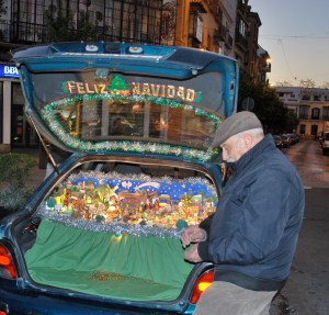 This guy comes every evening to the end of our street and plays Christmas music and displays his Belén from the back of his car.