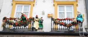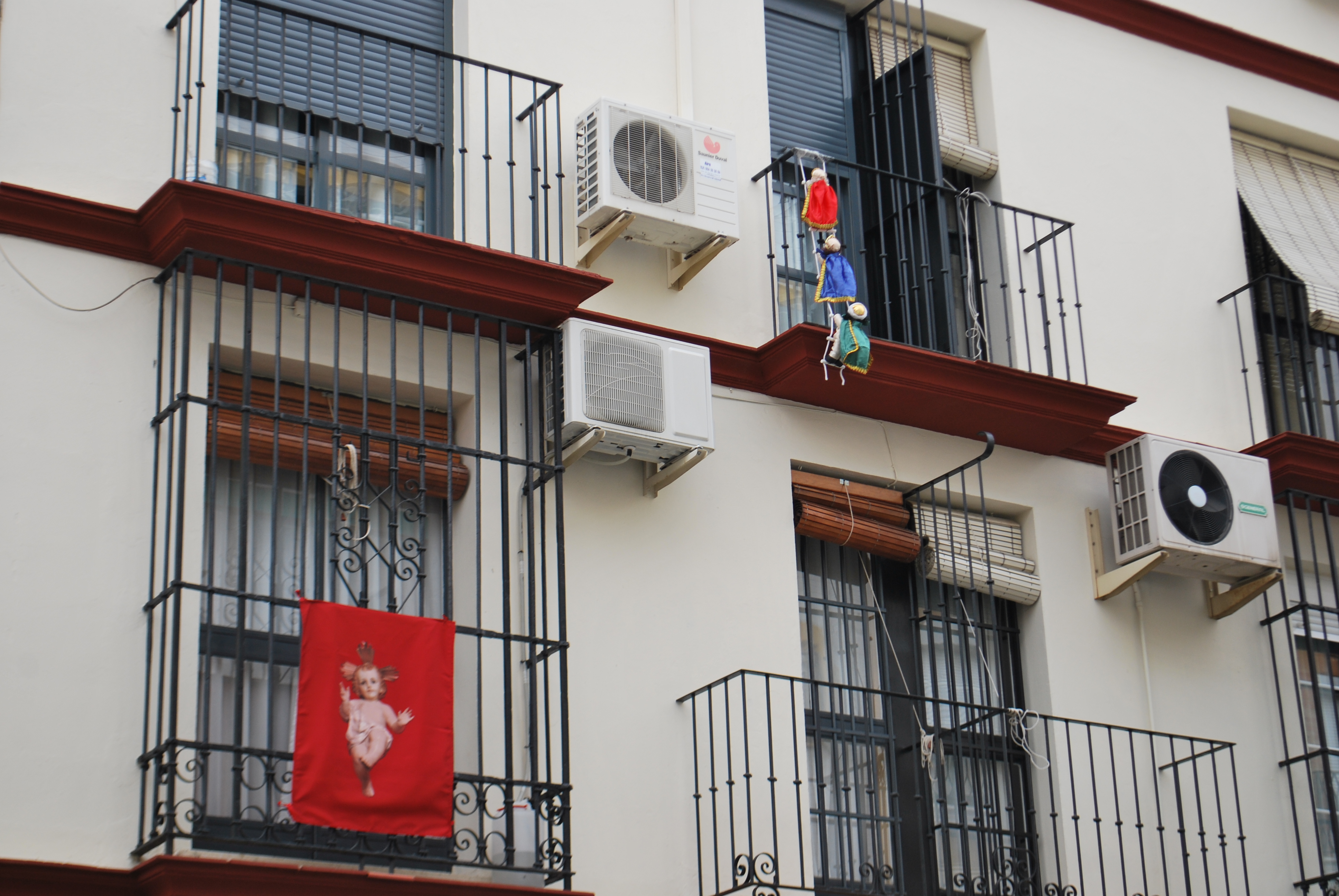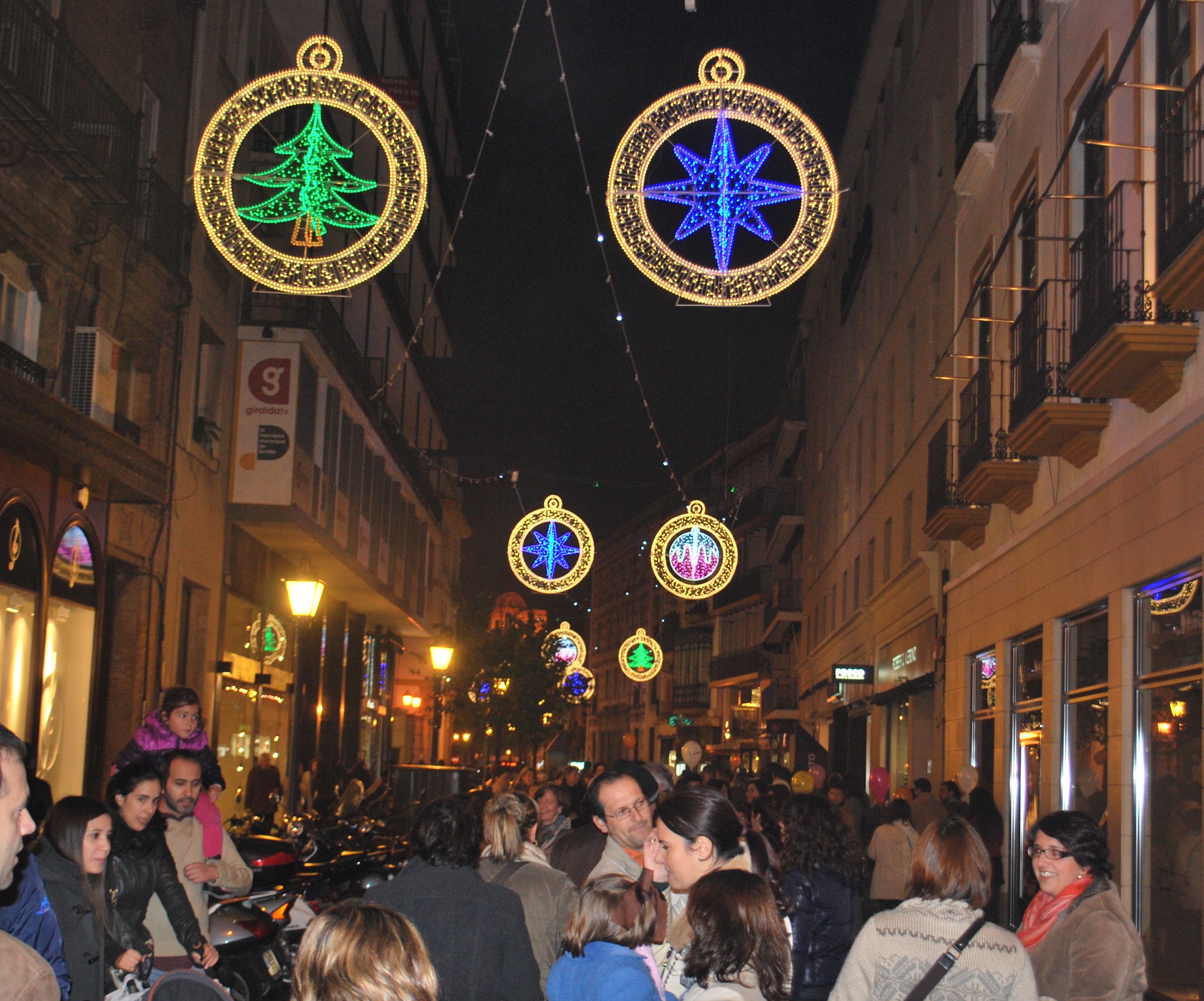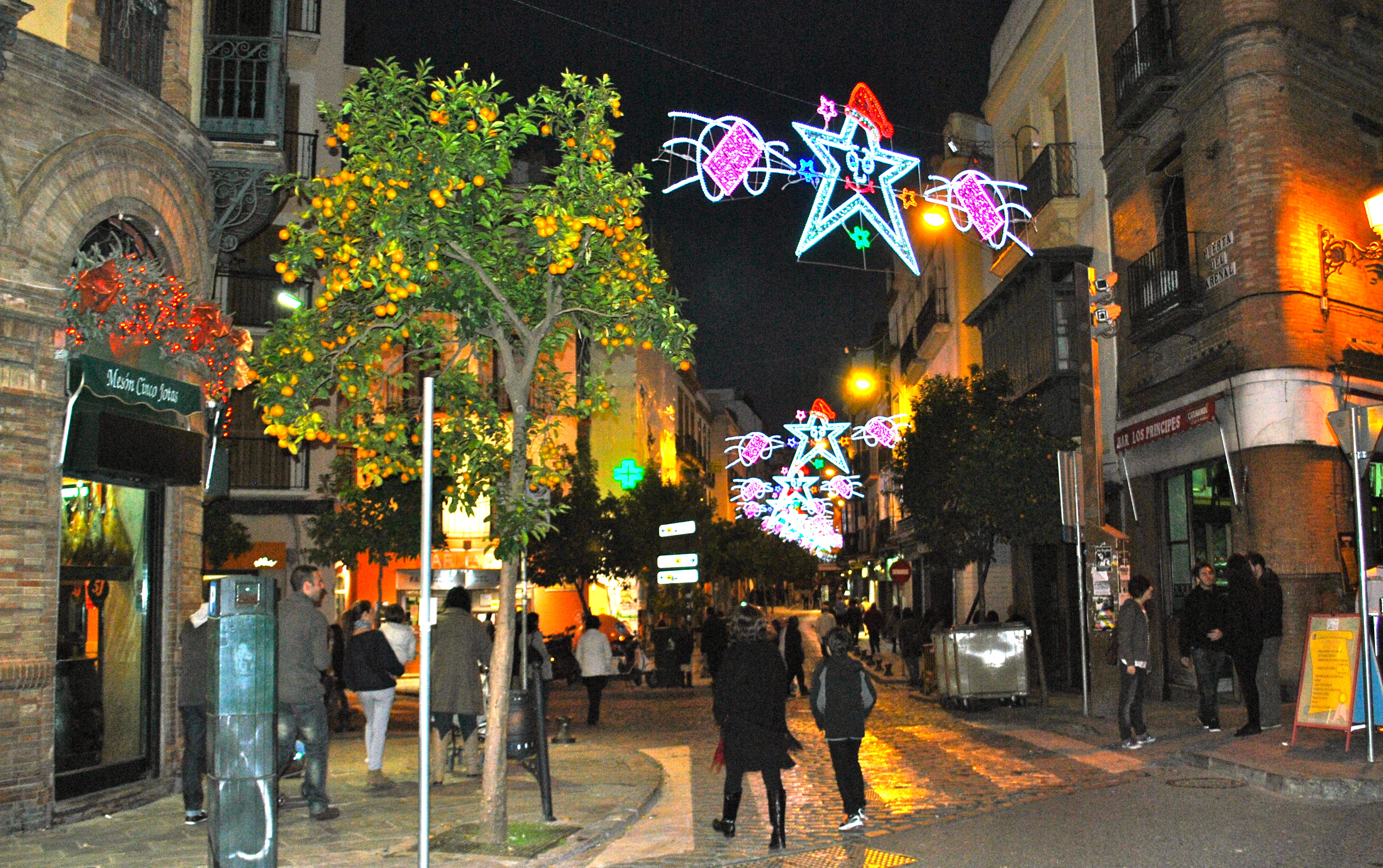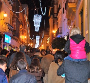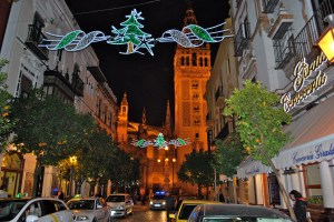 Feliz Navidad! One of the customs in Spain is to have an extravagant nativity scene or Belén. Yes, Mary, Joseph and little baby Jesus but then add on the whole village of Bethlehem; the shops, the farms, little fires roasting meals, whole neighborhoods, etc. They are fun to stop and look at as we wander about town. Our Flamenco teacher’s family has one of the best we’ve seen and they open the doors to their home for two showings per day for anyone who wants to take a look. As Kendal and I left one day from one of our classes there were three classes of very cute five and six year olds waiting patiently in line to go in and see the Belén, they had walked over from a nearby school for this field trip. In the center of town, right behind the Cathedral, there is a large market specifically for selling the little figures that make up the scene. Another tradition is that the Three Kings; Balthazar, Gaspar, and Melchior (Steve made me add their names, thought someone might be curious) bring gifts to the children on January 6th. Christmas is for family celebration and the sharing of a large meal, not presents. Some families are slowly changing and give gifts on Christmas but most hang on strong to the tradition of the Three Kings. As we walk about in the evening the streets are filled with lights – each street has a different design – we all have fun searching out these different designs.