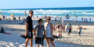 Our flight took us from Tokyo to the coastal city of Gold Coast, Australia, which is in the state of Queensland.  Amy really wanted to hit the campsites that she had been reading about and she found a great one in Gold Coast on Main Beach called the Gold Coast Holiday Park. Just imagine an extremely family friendly campsite surrounded by huge condominiums and directly across the street from the incredible roaring ocean beach.  It was so ideal. We would get up slow, the kids would do a little homework and then by 10am we were walking across the street to battle the intense waves for about 2 hours and head back for lunch.  After a little more homework we went back for round 2 at about 3pm for more wave battles. The beaches are so incredibly majestic and to have access like we had was a true blessing.